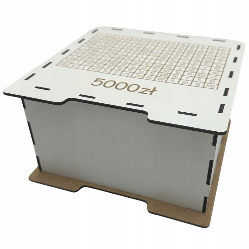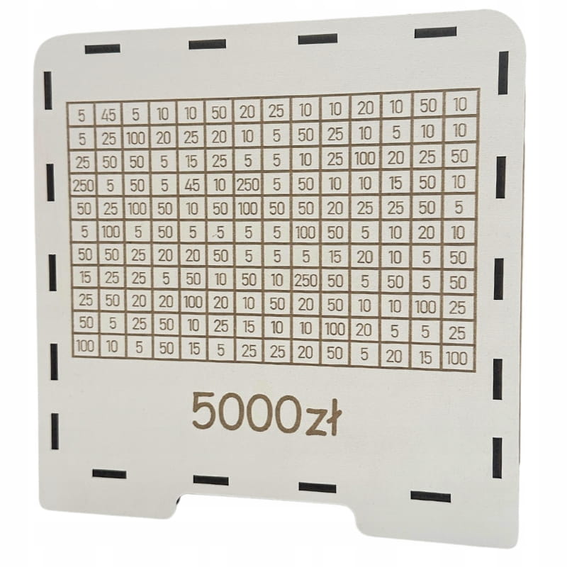 - Wygrawerowana tabelka: Na powierzchni skarbonki znajduje się tabelka, w której można wykreślać kolejne kwoty w miarę dodawania gotówki.