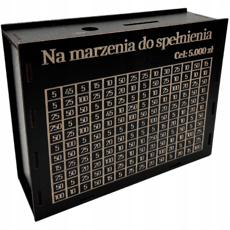 • Wygrawerowana tabelka: Na powierzchni skarbonki znajduje się tabelka, w której można wykreślać kolejne kwoty w miarę dodawania gotówki.