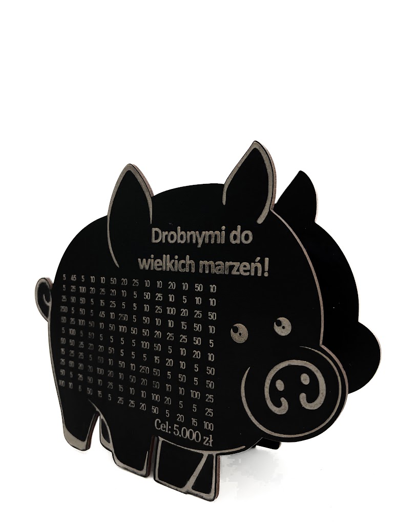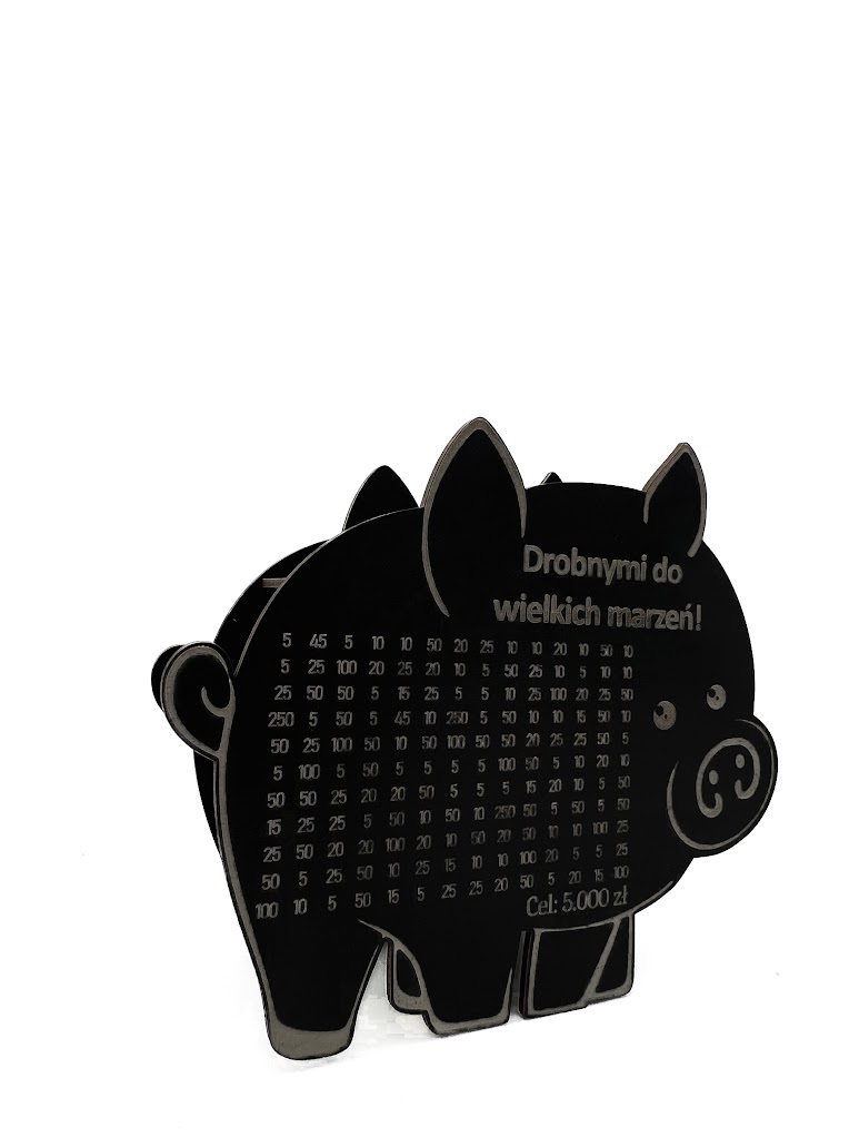 - Wygrawerowana tabelka: Na powierzchni skarbonki znajduje się tabelka, w której można wykreślać kolejne kwoty w miarę dodawania gotówki.