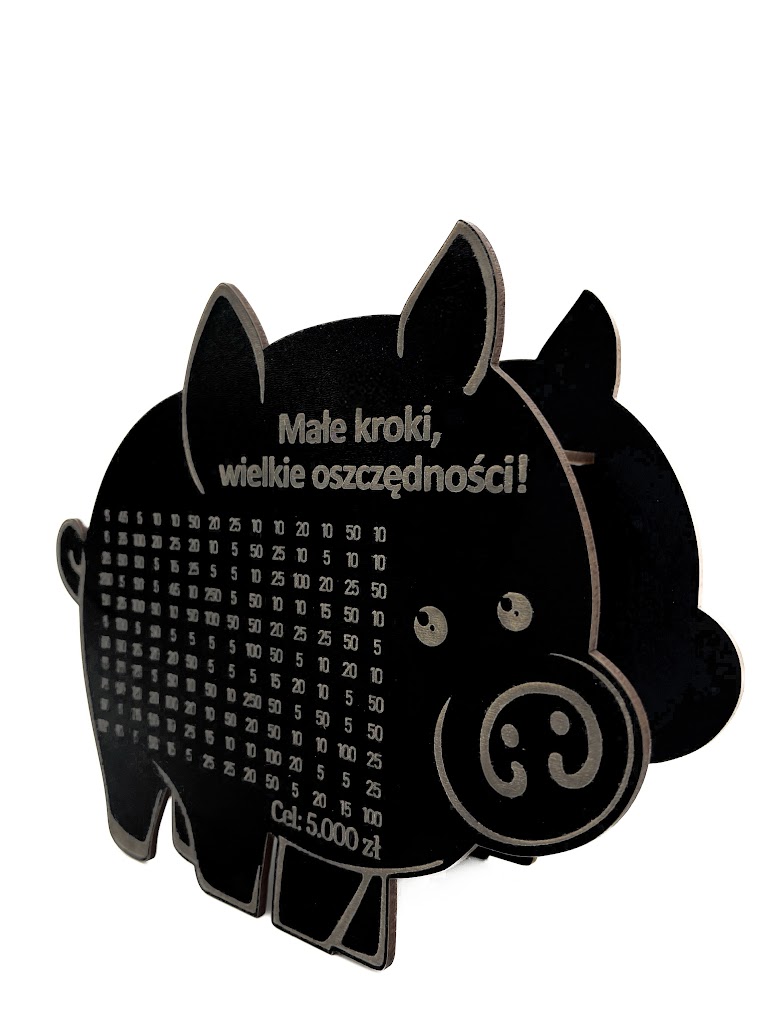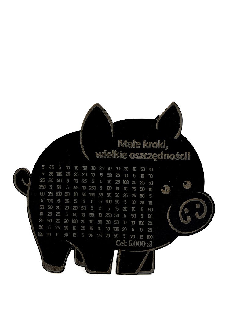 - Wygrawerowana tabelka: Na powierzchni skarbonki znajduje się tabelka, w której można wykreślać kolejne kwoty w miarę dodawania gotówki.