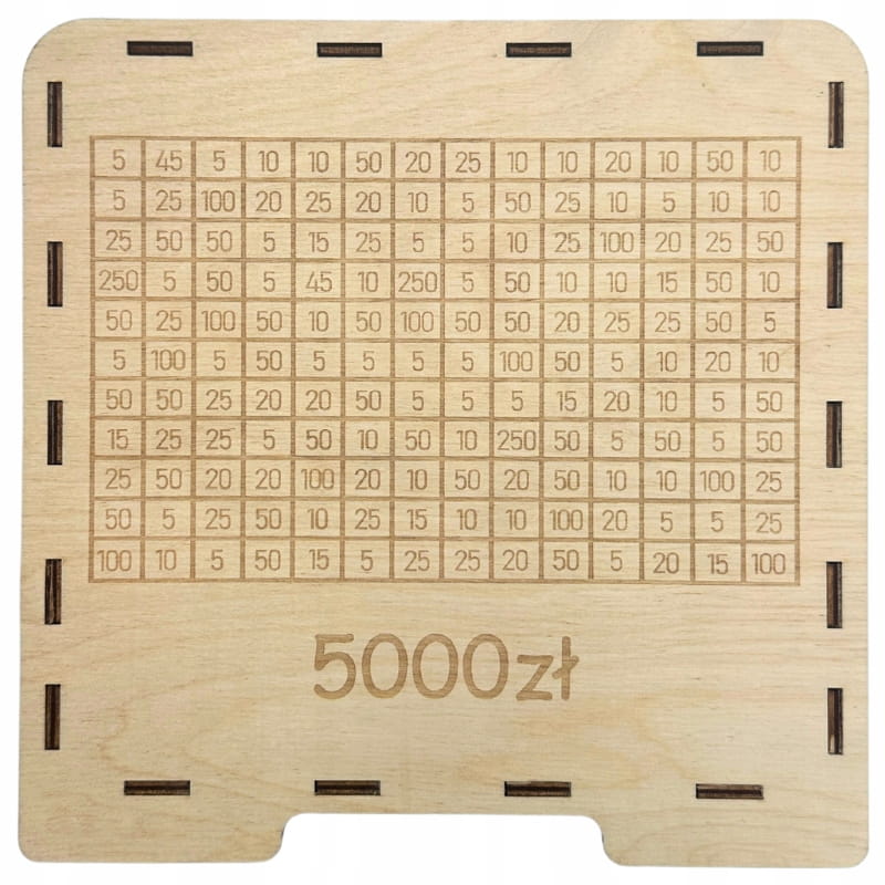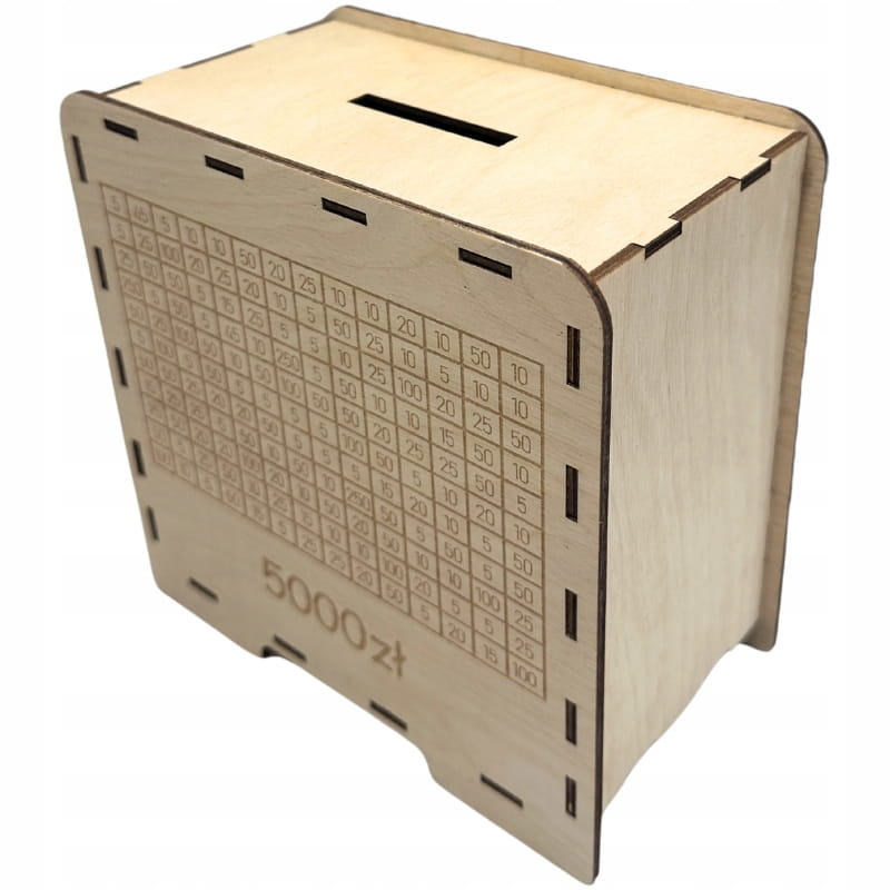 - Wygrawerowana tabelka: Na powierzchni skarbonki znajduje się tabelka, w której można wykreślać kolejne kwoty w miarę dodawania gotówki.