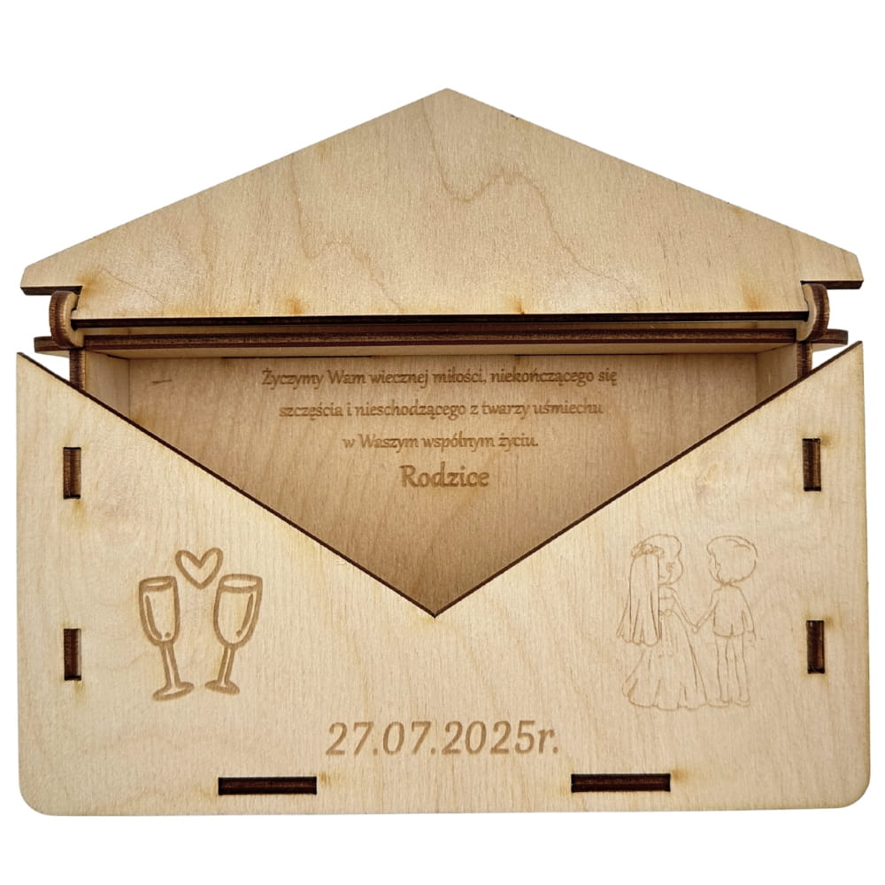 Ta elegancka koperta ze sklejki została zaprojektowana z myślą o dodaniu osobistego akcentu do życzeń ślubnych. Wykonana z wysokiej jakości materiałów, koperta jest trwała i idealnie nadaje się do przechowywania życzeń oraz drobnych przedmiotów. Możliwość personalizacji imionami nowożeńców oraz datą ślubu dodaje jej wyjątkowego charakteru, czyniąc ją idealnym prezentem dla pary młodej. To elegancki sposób przekazania życzeń, który zostanie doceniony przez każdą parę w ich wyjątkowym dniu.