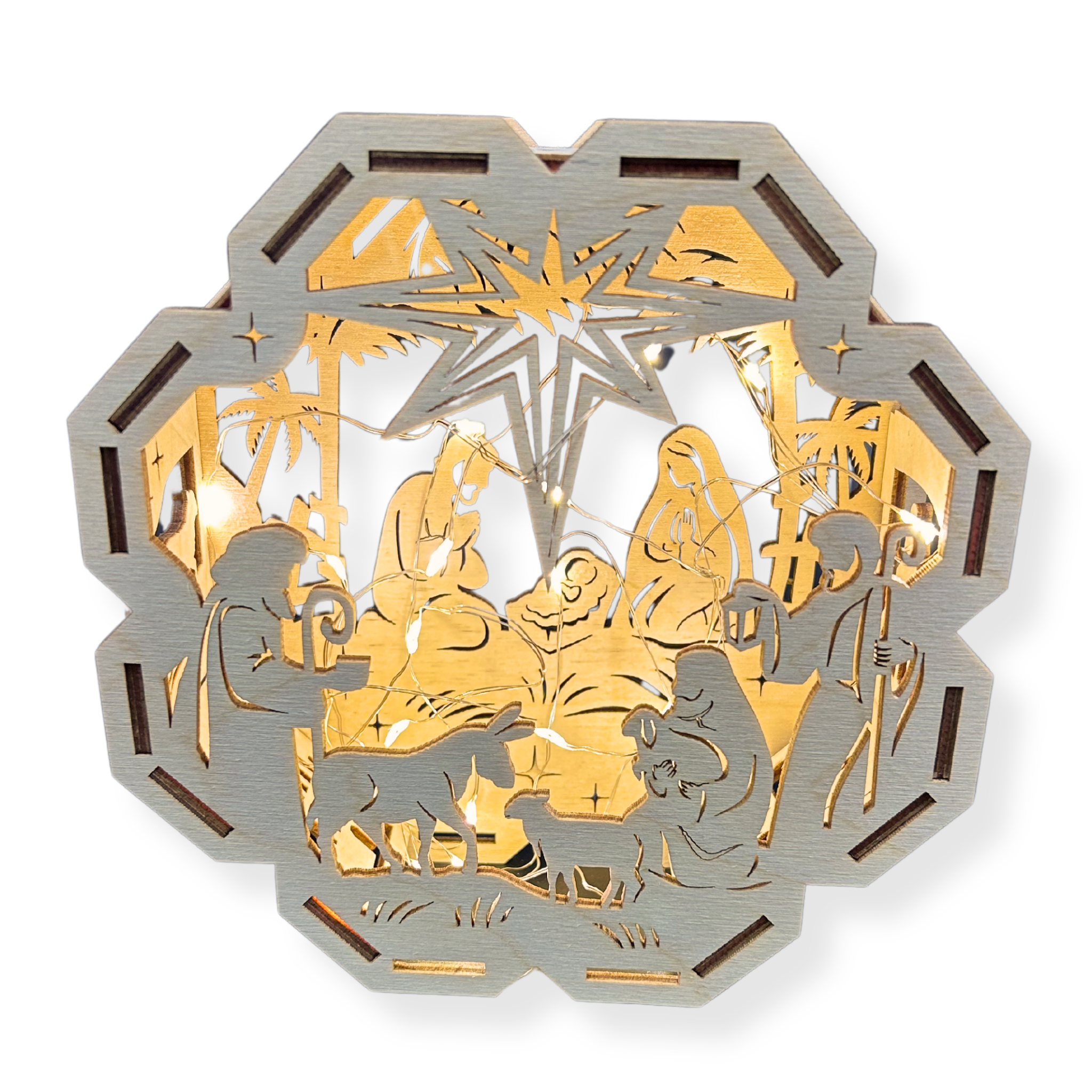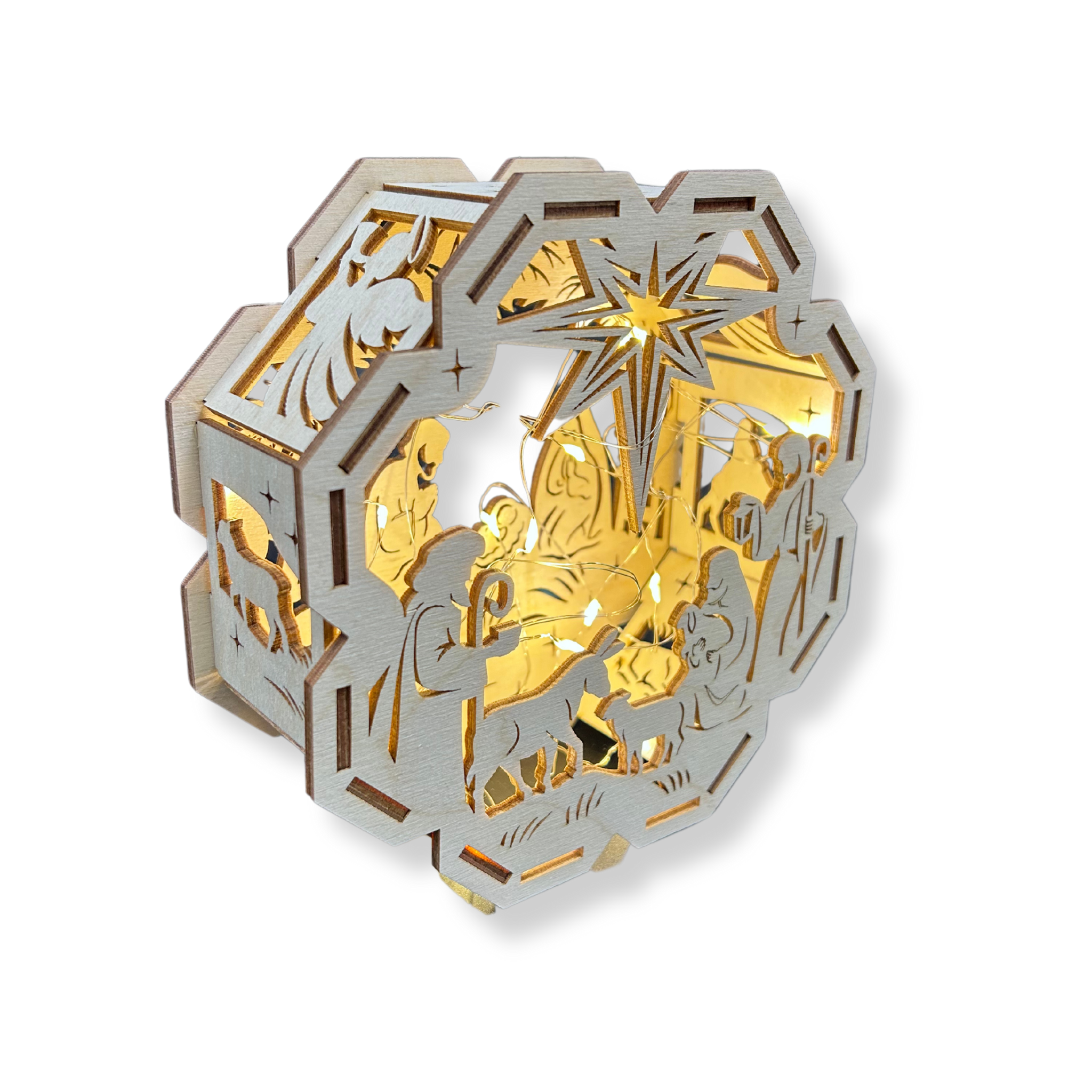 Lampion w kształcie sześcianu z wizerunkiem Stajenki. Jest to tradycyjny obrazek Świąt Bożego Narodzenia.