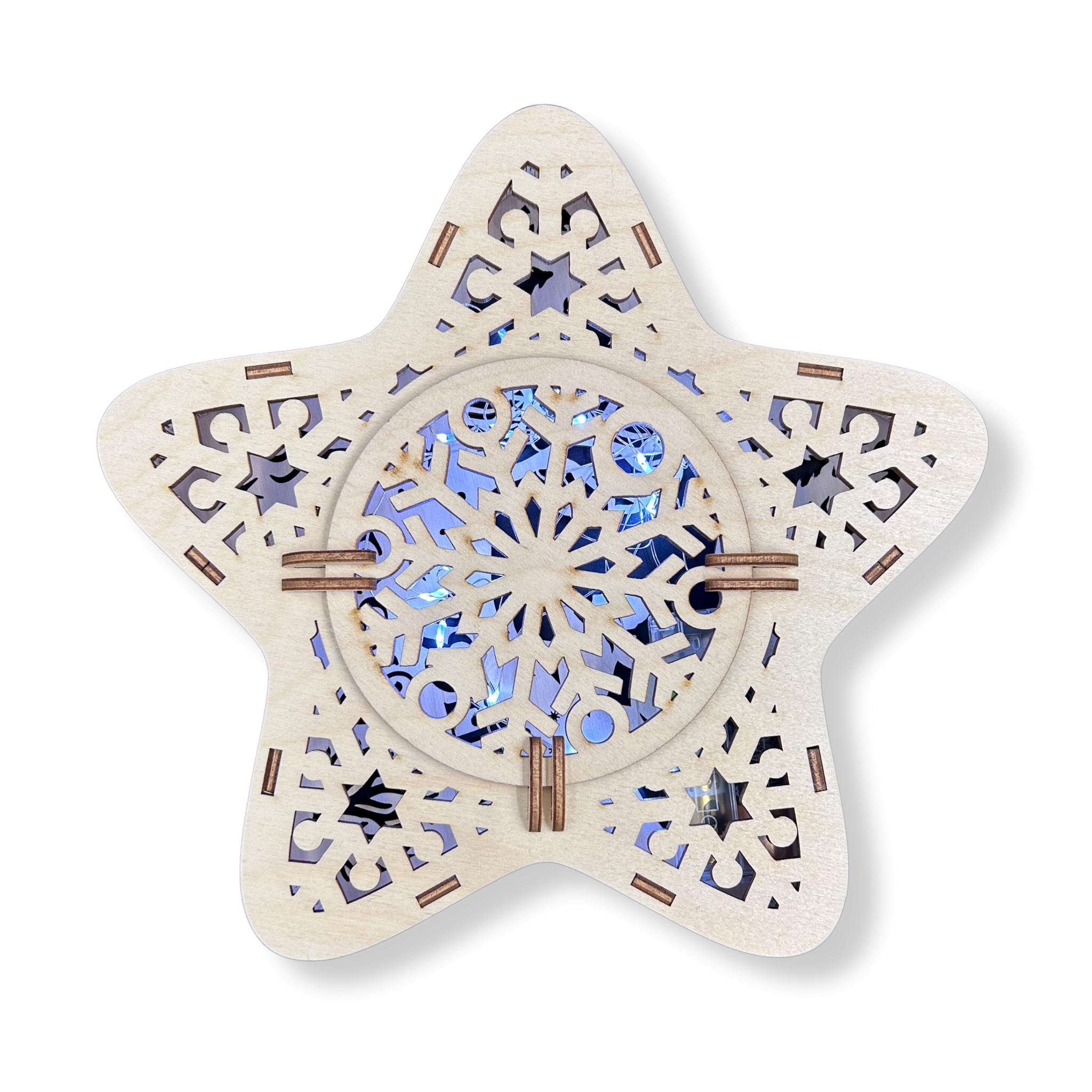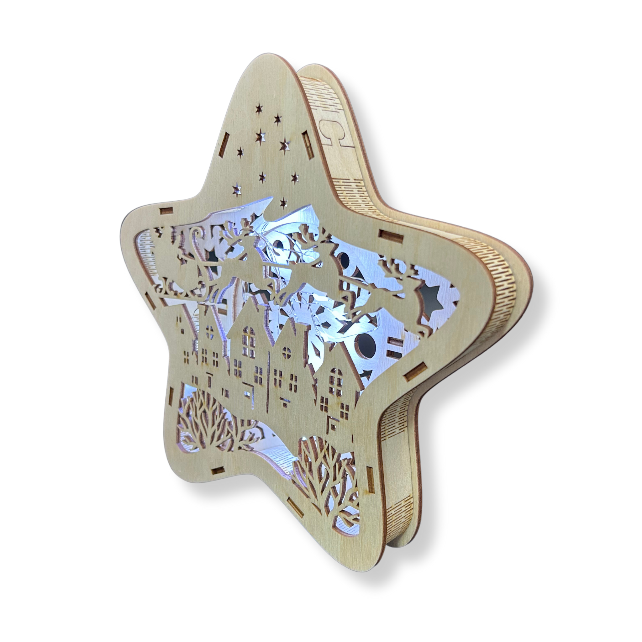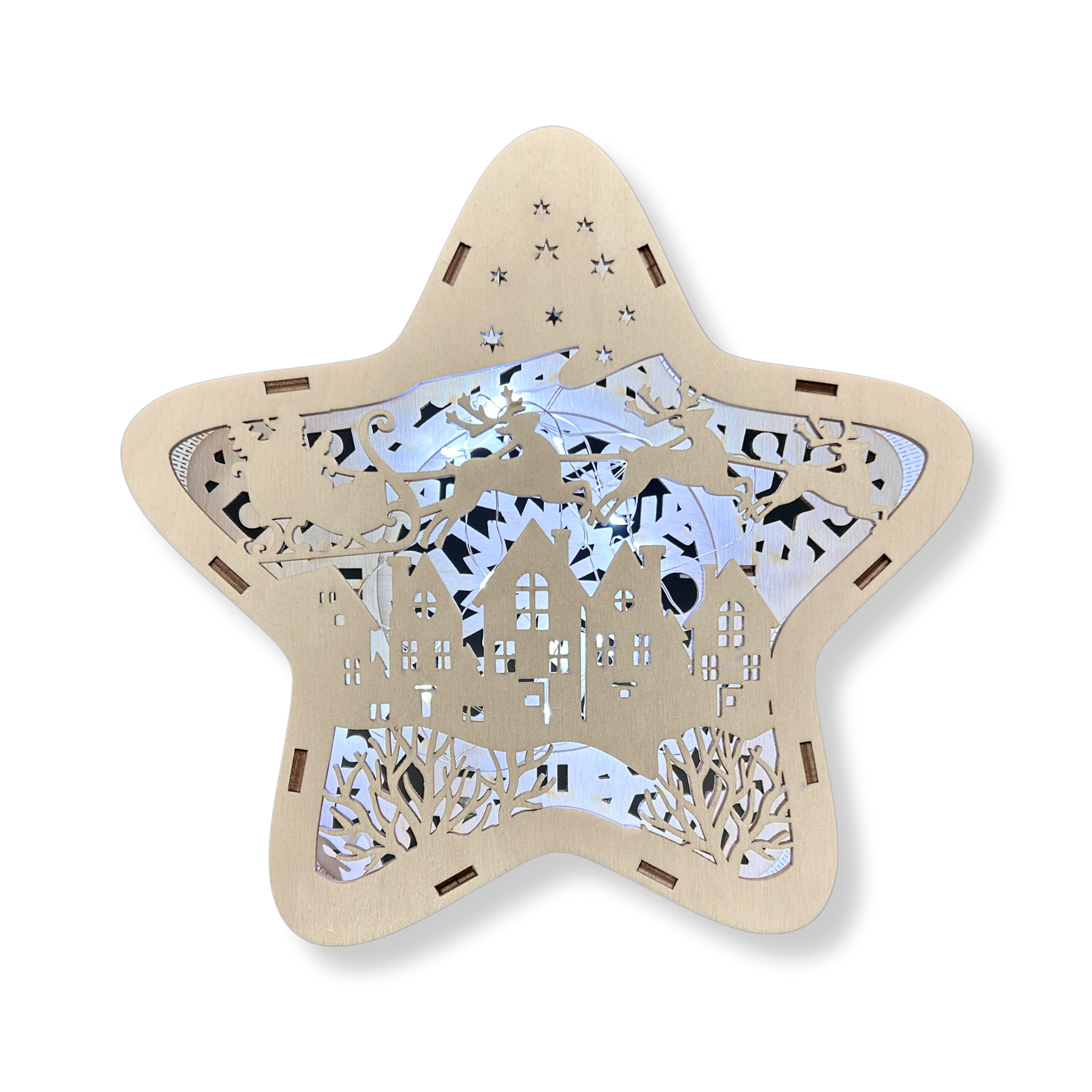 LAMPION Drewniana Gwiazdka ŚWIĄTECZNA – Sanie Mikołaja nad zimowym miastem