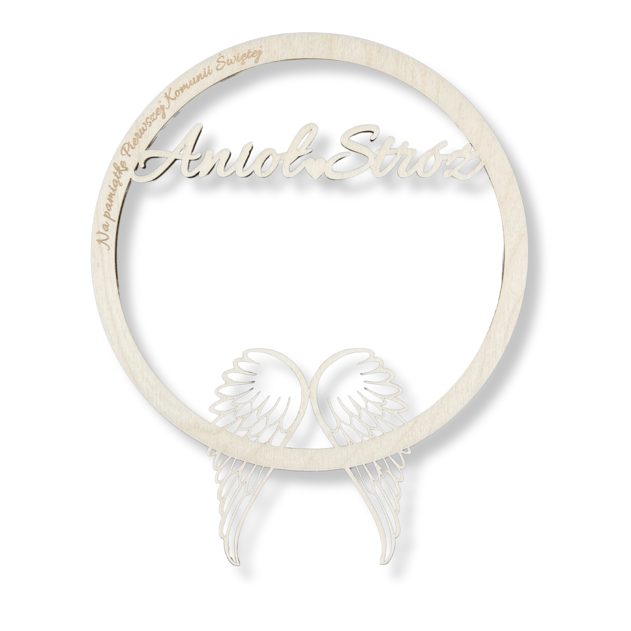 Drewniana obręcz Anioł Stróż ze skrzydłami do aniołka oraz grawerem „Na pamiątkę Pierwszej Komunii Świętej”