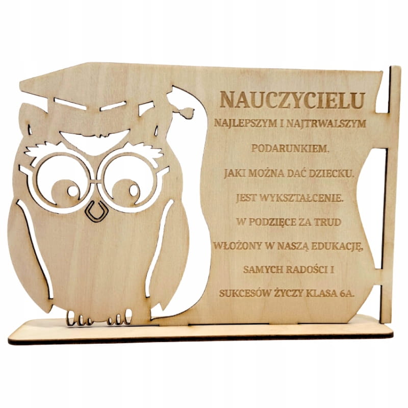 Sowa na podstawce z drewna sklejki to nie tylko piękna statuetka, ale również wyraz wdzięczności i uznania. Idealny prezent dla nauczyciela, mentora czy osoby bliskiej, której chcemy podziękować. To symboliczne serce symbolizuje naszą głęboką wdzięczność oraz docenienie ich trudu i wsparcia. Niech ta statuetka będzie wyrazem naszych serdecznych słów podziękowania i przywiązania. Możliwość wygrawerowania na niej dedykowanego tekstu, co jeszcze bardziej podkreśli nasze uczucia i będzie unikatowym prezentem.