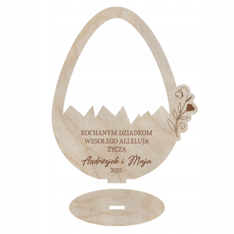 Elegancka ozdoba w kształcie jajka z uroczym motywem pękniętej skorupki i subtelnym kwiatowym zdobieniem. Dzięki personalizowanemu grawerowi to idealny upominek dla bliskich na Wielkanoc. Stabilna podstawka umożliwia wygodne ustawienie na stole, półce lub komodzie, dodając świątecznego uroku wnętrzu.