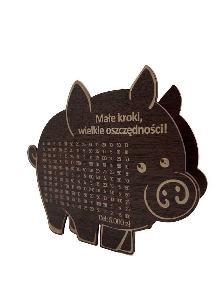 - Wygrawerowana tabelka: Na powierzchni skarbonki znajduje się tabelka, w której można wykreślać kolejne kwoty w miarę dodawania gotówki.