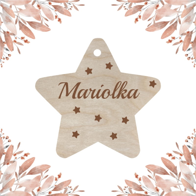 Nadaj swoim świętom wyjątkowy charakter dzięki eleganckiej zawieszce w kształcie gwiazdy z grawerowanym imieniem i ozdobnymi gwiazdkami! To piękna i unikalna dekoracja na choinkę, do stroików lub jako symboliczny upominek dla bliskiej osoby.
